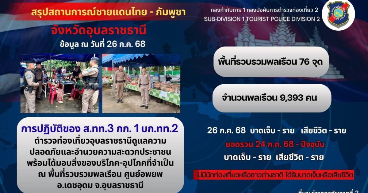 กองบัญชาการตำรวจท่องเที่ยวได้ติดตามและประสานงานอย่างใกล้ชิดกับหน่วยงานที่เกี่ยวข้อง ทั้งฝ่ายไทยและกัมพูชา เพื่อดูแลความปลอดภัยของประชาชนและนักท่องเที่ยวในพื้นที่ชายแดน พร้อมให้ข้อมูลและอำนวยความสะดวกแก่ผู้ที่ได้รับผลกระทบอย่างเต็มกำลัง หากต้องการความช่วยเหลือ ติดต่อสายด่วนตำรวจท่องเที่ยว 1155 ตลอด 24 ชั่วโมง