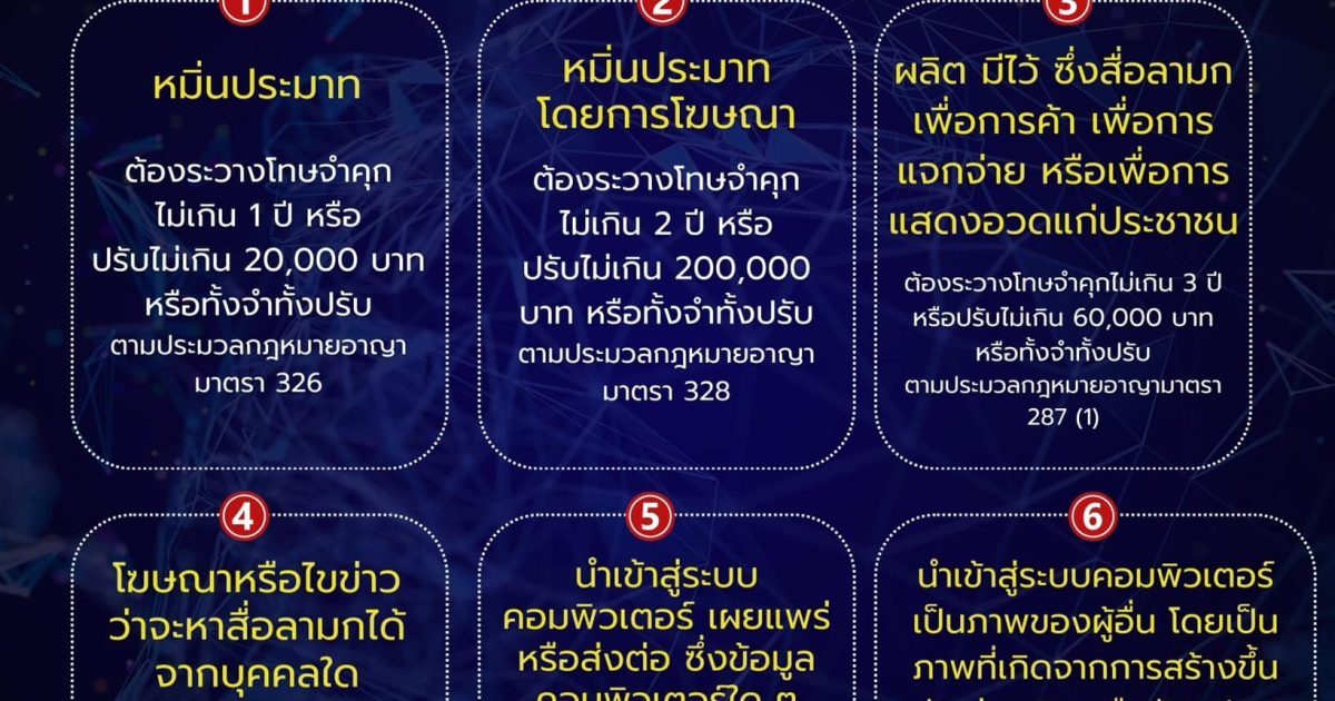 5. ความผิดฐาน “นำเข้าสู่ระบบคอมพิวเตอร์ เผยแพร่ หรือส่งต่อ ซึ่งข้อมูลคอมพิวเตอร์ใด ๆ ที่มีลักษณะอันลามกและข้อมูลคอมพิวเตอร์นั้นประชาชนทั่วไปอาจเข้าถึงได้” – ต้องระวางโทษจำคุกไม่เกิน 5 ปี หรือปรับไม่เกิน 100,000 บาท หรือทั้งจำทั้งปรับ ตาม พ.ร.บ.ว่าด้วยการกระทำความผิดเกี่ยวกับคอมพิวเตอร์ พ.ศ.2550 และที่แก้ไขเพิ่มเติม มาตรา 14(4) หรือ มาตรา 14(5) แล้วแต่กรณี