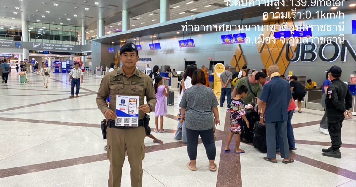 ด.ต.ระพีพัฒน์ หงษ์จันทร์ ชุดปฏิบัติการประจำท่าอากาศยาน จว.อุบลราชธานี ปฏิบัติหน้าที่ดูแลอำนวยความสะดวก รักษาความปลอดภัย ให้กับประชาชนเเละนักท่องเที่ยว เเละได้ประชาสัมพันธ์ สายด่วน 1155 และแอพพลิเคชั่น Thailand Tourist Police & stop walk and talk ให้กับประชาชน ตามนโยบาย ผบช.ทท. ณ ท่าอากาศยานนานาชาติอุบลราชธานี