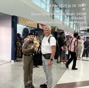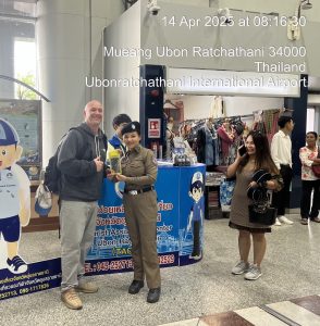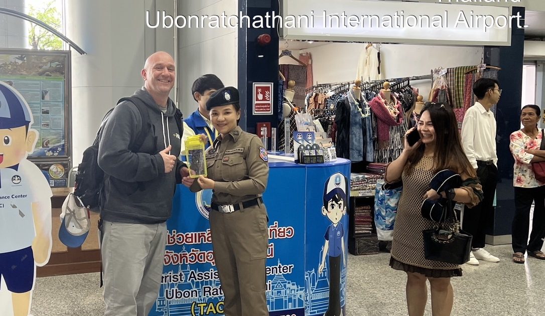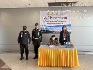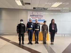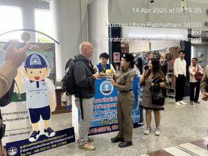 ด.ต.หญิงอังคณา ทรงอยู่ ชุดปฏิบัติการท่าอากาศยานนานาชาติอุบลราชธานี ปฏิบัติหน้าที่ดูแลอำนวยความสะดวก รักษาความปลอดภัย,ให้กับประชาชน,ผู้โดยสาร,นักท่องเที่ยว ในช่วงเทศกาลสงกรานต์ 2568 แจกซองกันน้ำแก่นักท่องเที่ยวเเละได้ประชาสัมพันธ์ แอพพลิเคชั่น Thailand Tourist Police & stop walk and talkให้กับประชาชน ตามนโยบาย ผบช.ทท ณ ท่าอากาศยานนานาชาติอุบลราชธานี