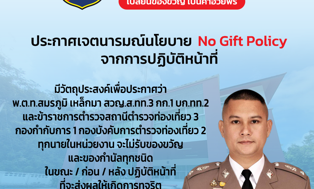 ประกาศกสถานีตำรวจท่องเที่ยวอุบลราชธานี เรื่อง เจตนารมณ์ที่จะไม่รับของขวัญและของกำนัลทุกชนิดจากการปฏิบัติหน้าที่ (No Gift Policy) 1 มกราคม 2567 โดย admin / ข่าวประชาสัมพันธ์,ข่าวกิจกรรม,ข่าวประชาสัมพันธ์,ข่าวประชาสัมพันธ์,ข่าวฝากประชาสัมพันธ์,ข่าวภารกิจผู้บังคับบัญชา ประกาศกสถานีตำรวจท่องเที่ยวอุบลราชธานี เรื่อง เจตนารมณ์ที่จะไม่รับของขวัญและของกำนัลทุกชนิดจากการปฏิบัติหน้าที่ (No Gift Policy) #ตำรวจท่องเที่ยว Facebook iconFacebookTwitter iconTwitterLINE iconLine