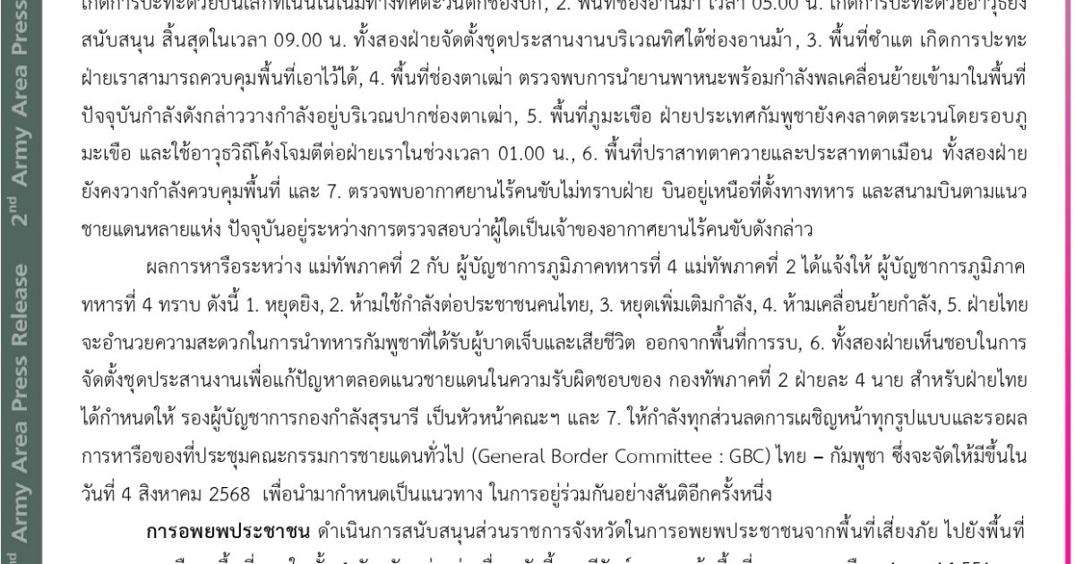 ศูนย์ปฏิบัติการกองทัพภาคที่ 2 สรุปสถานการณ์การสู้รบตามแนวชายแดนไทย-กัมพูชา ประจำวันที่ 29 กรกฎาคม 2568 (ณ เวลา 14.00 น.)