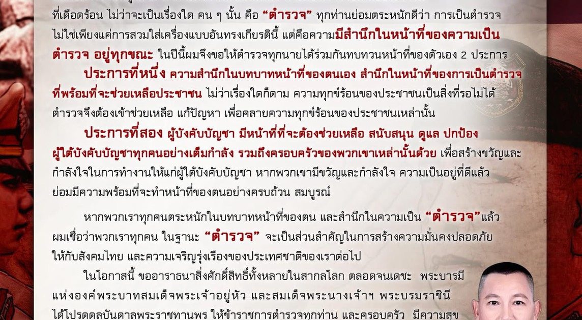 ทุกท่านย่อมตระหนักดีว่า การเป็นตำรวจไม่ใช่เพียงแค่การสวมใส่เครื่องแบบอันทรงเกียรตินี้ แต่คือความมีสำนึกในหน้าที่ของความเป็นตำรวจอยู่ทุกขณะ ในปีนี้ผมจึงขอให้ตำรวจทุกนายได้ร่วมกันทบทวนหน้าที่ของตัวเอง 2 ประการ
