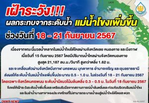 สำนักงานทรัพยากรน้ำแห่งชาติ (สทนช.) ประกาศ เฝ้าระวัง!!! ผลกระทบจากระดับน้ำแม่น้ำโขงเพิ่มขึ้น ช่วงวันที่ 16 – 21 กันยายน 2567