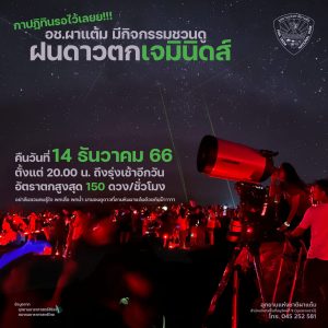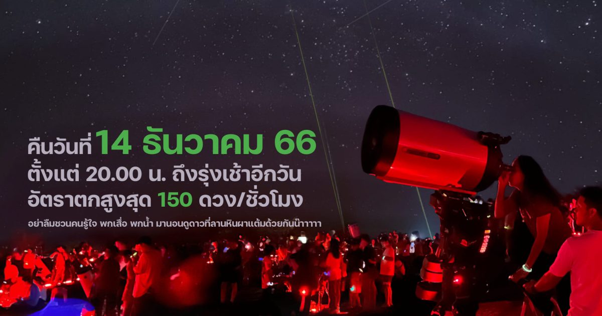 14 ธันวาคม 2566 ตั้งแต่ 20.00 น.ถึงรุ่งเช้าอีกวัน อัตราตกสูงสุด 150 ดวง/ชั่วโมง