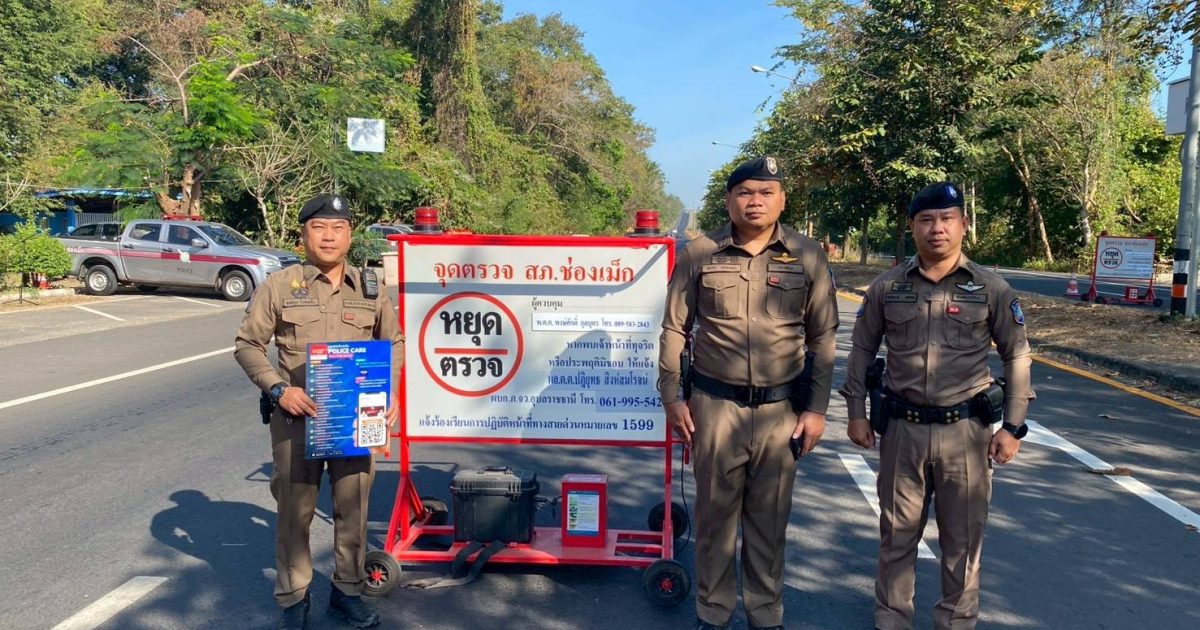พ.ต.ท.ธนากร ธรรมเมธา สวญ.ส.ทท.3 กก.1 บก.ทท.2 พร้อมด้วยชุดปฏิบัติสายตรวจ ชป.ด่านพรมแดนช่องเม็ก ร่วมพิธีปล่อยแถวและเปิดศูนย์ป้องกันรณรงค์ลดอุบัติเหตุ อำนวยความสะดวกด้านการจราจร ในห้วงเทศกาลวันปีใหม่ 2569 30 ธันวาคม 2568 โดย admin / ข่าวประชาสัมพันธ์,ข่าวกิจกรรม,ข่าวประชาสัมพันธ์,ข่าวประชาสัมพันธ์,ข่าวฝากประชาสัมพันธ์,ข่าวภารกิจผู้บังคับบัญชา พ.ต.ท.ธนากร ธรรมเมธา สวญ.ส.ทท.3 กก.1 บก.ทท.2 พร้อมด้วยชุดปฏิบัติสายตรวจ ชป.ด่านพรมแดนช่องเม็ก ร่วมกับ สภ.ช่องเม็ก,ตม.ช่องเม็ก,มว.ตชด.2261,กองร้อยทหารพรานจู่โจม,ร้อย อส. อ.สิรินธร และหน่วยงานราชการในพื้นที่ เข้าร่วมพิธีปล่อยแถวและเปิดศูนย์ป้องกันรณรงค์ลดอุบัติเหตุและการบังคับใช้กฎหมาย อำนวยความสะดวกด้านการจราจร การบังคับใช้กฎหมาย และ ประชาสัมพันธ์ แอปพลิเคชัน POLICE CARE , สายด่วน 1155 ให้กับประชาชน และ นักท่องเที่ยว ในห้วงเทศกาลวันปีใหม่ 2569 ณ ตู้ยามห้วยหลวง สภ.ช่องเม็ก อ.สิรินธร จว.อุบลราชธานี #ตำรวจท่องเที่ยวอุบลราชธานี #CallCenter1155 #PoliceCareApp #ThailandTouristPoliceApp #YourFirstFriend Facebook iconFacebookTwitter iconTwitterLINE iconLine