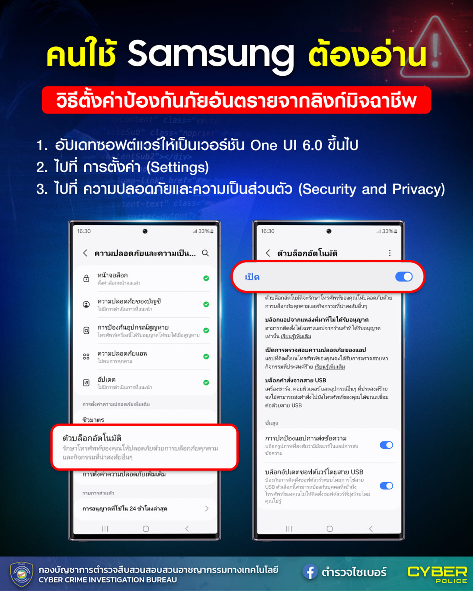 ตำรวจไซเบอร์ชวนแก้เกมโจรออนไลน์ คนใช้ Samsung ต้องอ่าน วิธีตั้งค่าบล็อกลิงก์มิจฉาชีพ ป้องกันแอปหลอกด