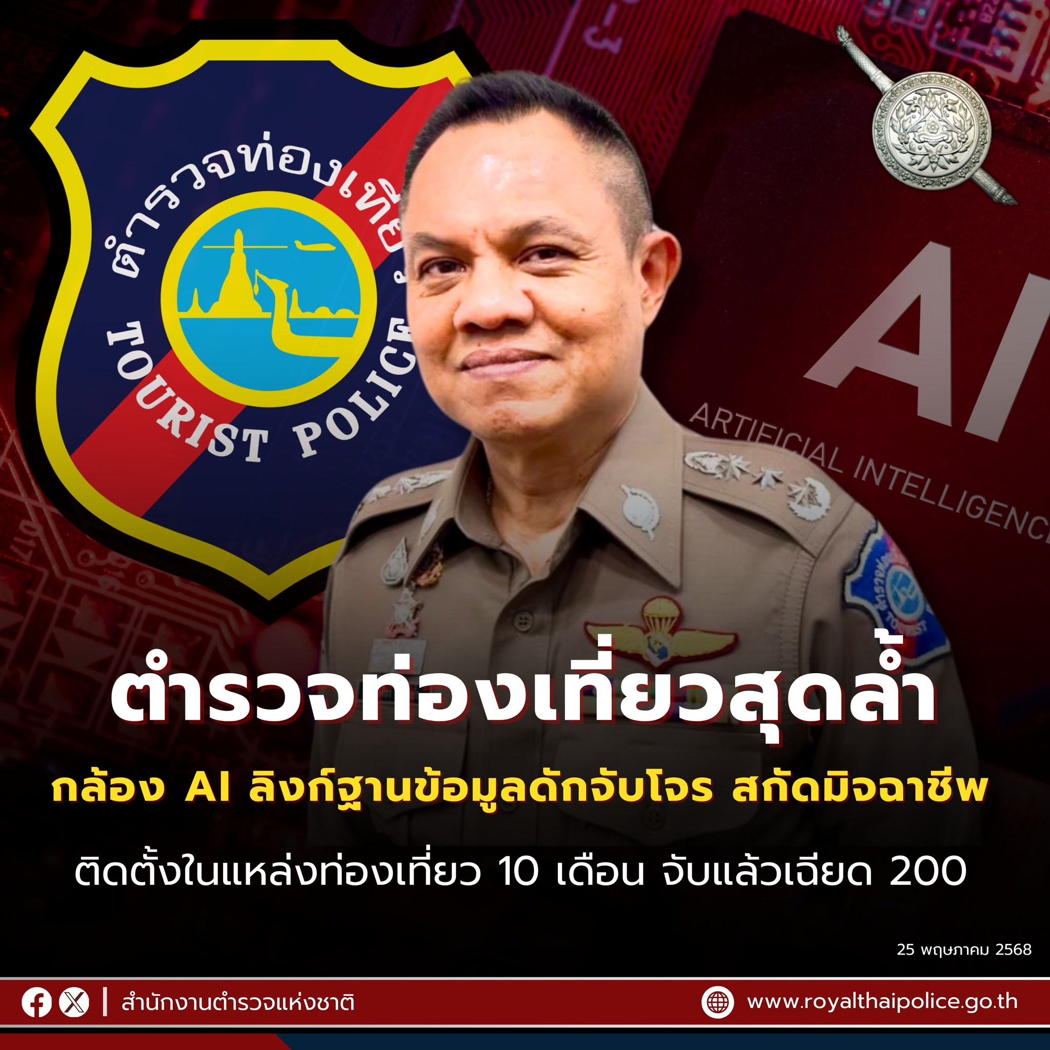 ท่องเที่ยวไทยปลอดภัย “ตำรวจท่องเที่ยว” สุดล้ำ ใช้กล้อง AI เชื่อมฐานข้อมูล ดักจับโจร สกัดมิจฉาชีพ ในแ