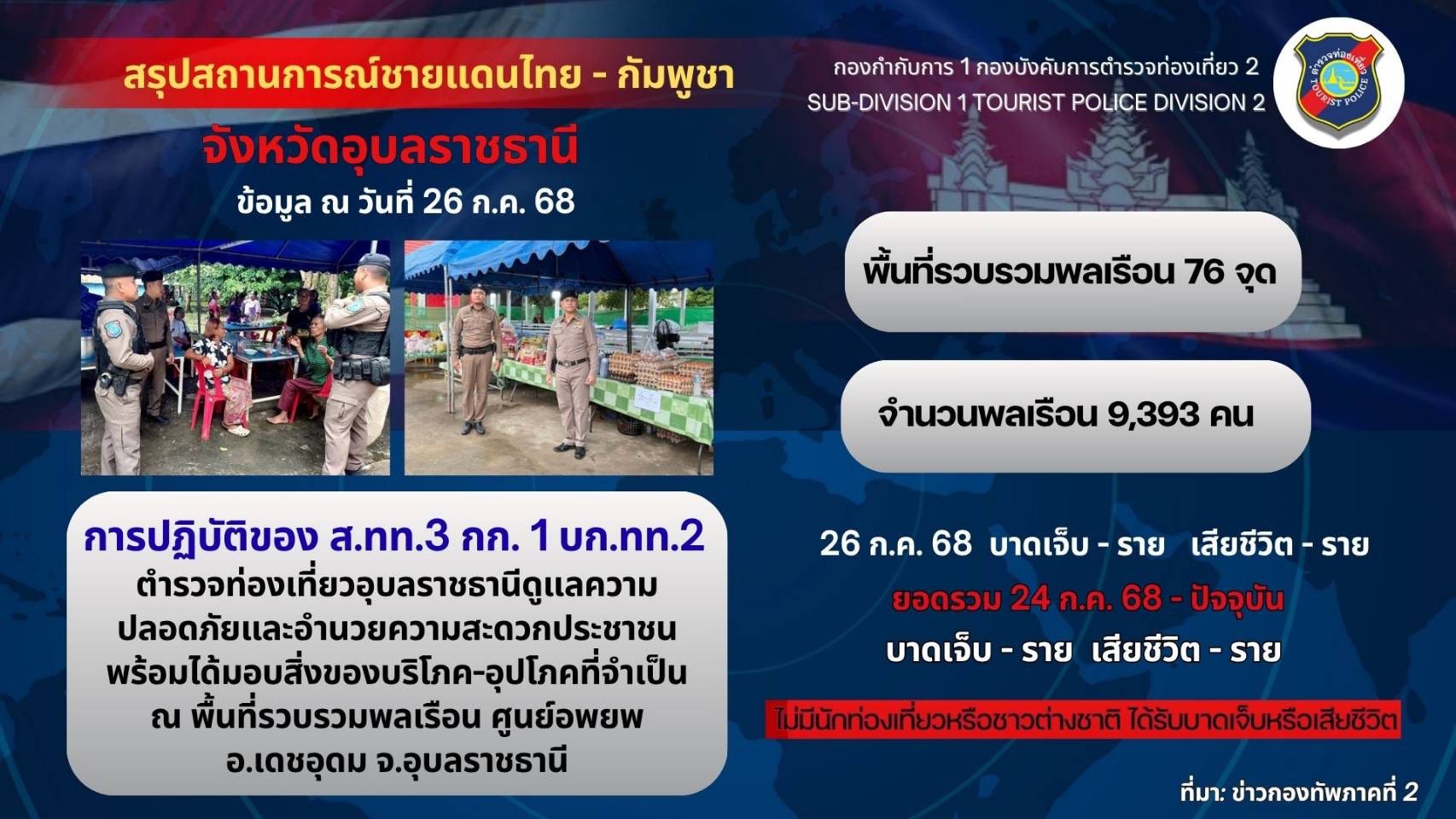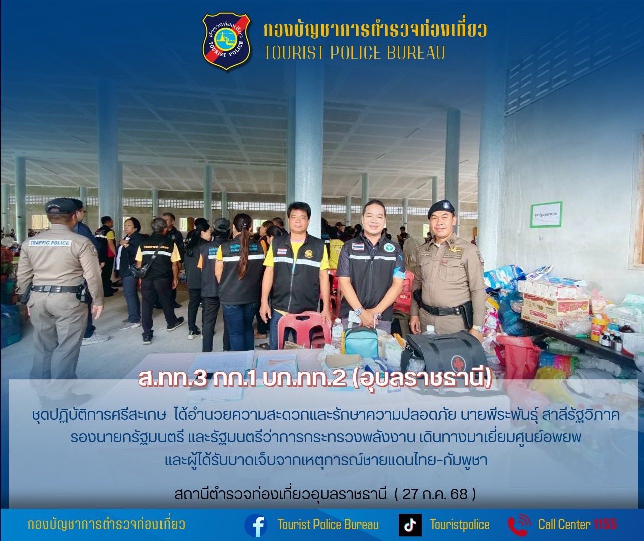 ตำรวจท่องเที่ยวอุบลราชธานี มอบสิ่งของให้แก่ผู้อพยพ จากสถานการณ์ชายแดนไทย-กัมพูชา 27 กรกฎาคม 2568 โดย admin