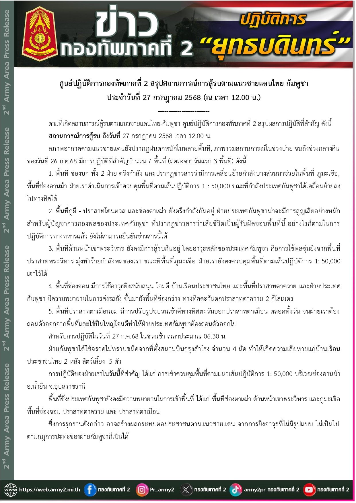 ศปก.ทภ.2 สรุปสถานการณ์การสู้รบตามแนวชายแดนไทย-กัมพูชา ประจำวันที่ 27 กรกฎาคม 2568 (ณ เวลา 12.00 น.) 27 กรกฎาคม 2568 โดย admin