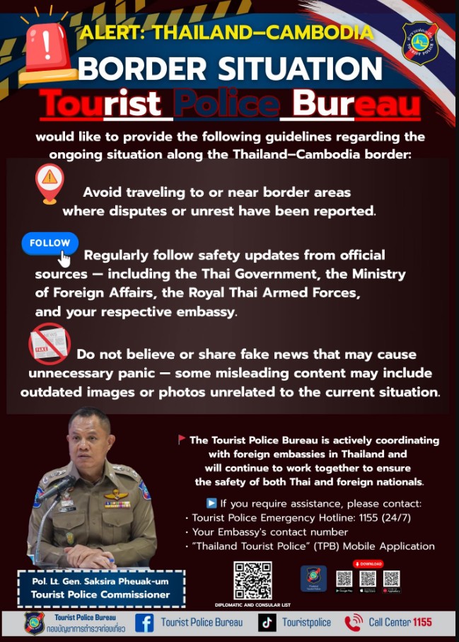 กองบัญชาการตำรวจท่องเที่ยวได้ติดตามและประสานงานอย่างใกล้ชิดกับหน่วยงานที่เกี่ยวข้อง ทั้งฝ่ายไทยและกัมพูชา เพื่อดูแลความปลอดภัยของประชาชนและนักท่องเที่ยวในพื้นที่ชายแดน พร้อมให้ข้อมูลและอำนวยความสะดวกแก่ผู้ที่ได้รับผลกระทบอย่างเต็มกำลัง หากต้องการความช่วยเหลือ ติดต่อสายด่วนตำรวจท่องเที่ยว 1155 ตลอด 24 ชั่วโมง 27 กรกฎาคม 2568 โดย admin