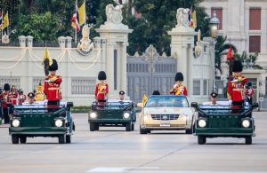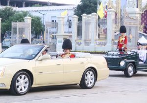 พระบาทสมเด็จพระเจ้าอยู่หัว และ สมเด็จพระนางเจ้าฯพระบรมราชินี เสด็จพระราชดำเนินไปยังรถยนต์พระที่นั่ง เพื่อประทับรถยนต์พระที่นั่งเสด็จออกจากพระลานพระราชวังดุสิตกลับพระที่นั่งอัมพรสถาน พระราชวังดุสิต ระหว่างที่รถพระที่นั่งกำลังเคลื่อนเข้าสู่ทางประตูภูธรลีลาศนั้น รองผู้บังคับกองผสมนำกำลังพลสวนสนามฯ และผู้ร่วมในพิธีเปล่งเสียงทรงพระเจริญดังกึกก้องทั่วพระลานพระราชวังดุสิต