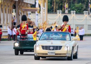 พระบาทสมเด็จพระเจ้าอยู่หัวประทับยืนบนรถยนต์พระที่นั่ง ทรงตรวจพลสวนสนามโดยรถยนต์พระที่นั่งจำนวน 4 กรม 10 กองพัน ซึ่งประกอบด้วย กรมทหารรักษาวังมหาดเล็กราชวัลลภรักษาพระองค์ กองบัญชาการทหารมหาดเล็กราชวัลลภรักษาพระองค์ หน่วยบัญชาการถวายความปลอดภัยรักษาพระองค์, กรมนักเรียนนายร้อยรักษาพระองค์ โรงเรียนนายร้อยพระจุลจอมเกล้า, กรมนักเรียนนายเรือรักษาพระองค์ โรงเรียนนายเรือ, กรมนักเรียนนายเรืออากาศรักษาพระองค์ โรงเรียนนายเรืออากาศนวมินทกษัตริยาธิราช, กองพันทหารราบที่ 1 กรมทหารราบที่ 31 รักษาพระองค์ , กองพันทหารอากาศโยธิน 3 กรมทหารอากาศโยธิน รักษาพระองค์ หน่วยบัญชาการนาวิกโยธิน , กองพันทหารม้าที่ 25 กรมทหารม้าที่ 4 รักษาพระองค์, กองพันทหารราบที่ 2 กรมทหารราบที่21 รักษาพระองค์, กองพันทหารปืนใหญ่ที่ 102 กรมทหารปืนใหญ่ที่ 2 รักษาพระองค์, กองพันทหารราบที่ 1 รักษาพระองค์ กรมทหารราบที่ 1 และกองพลนาวิกโยธิน หน่วยบัญชาการนาวิกโยธิน